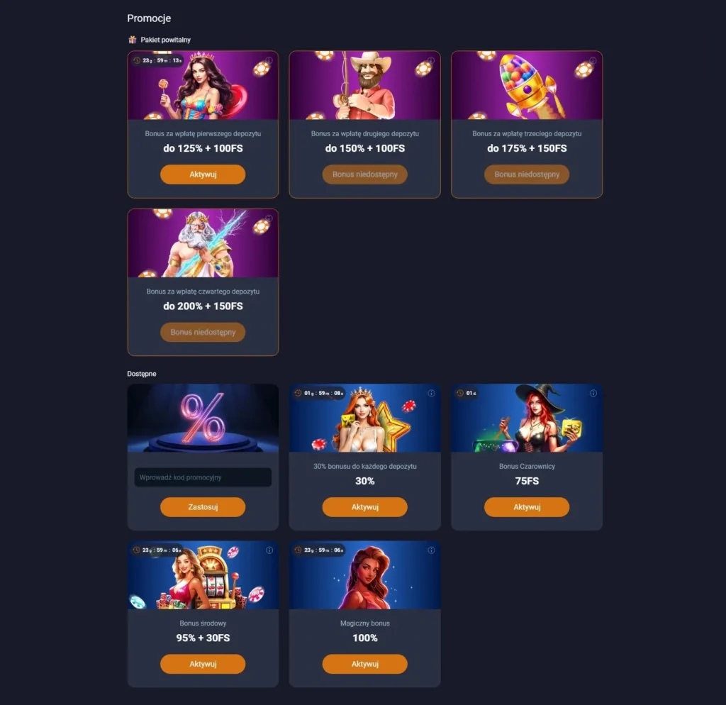 Oczywiście! Pakiet powitalny to do 10 000 PLN i 500 spinów na pierwsze depozyty. Czasem dostępne są też bonusy.